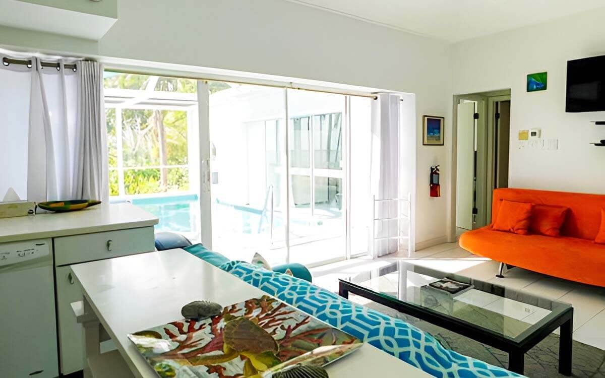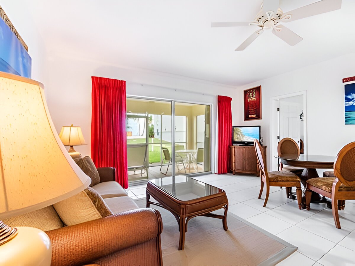 Ground floor, turn-key 1 bedroom with beach views next door to Rum Point Restaurant and Beach and 2 mins drive to Kaibo! Open plan renovated living room, kitchen, dining, leading to the private screened-in patio. One huge bedroom with a king bed. Stunning beach views in a 3 Acre Site with 675 feet of beach frontage. On site Pool, tennis court, gym, game room, two beaches, and Rum Point Club next door. The area directly in front and to the left of the Retreat is a designated and protected marine park. The snorkelling is excellent right in front of the complex. Sunsets are often enjoyed from the private beach all year round. This quieter side of the island provides peace and tranquillity. Head next door to Red Sail for motorized and non-motorized water sport options or excursions to Stingray city or scuba diving when you are ready for some action.