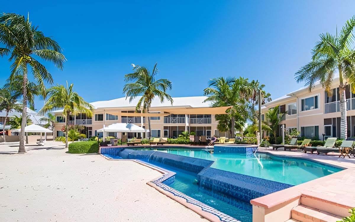 Situated within the prestigious development of Cayman Kai, The Kaibo Condominiums Phase II are located next door to The Kaibo Beach Bar and Grill, Upstairs Restaurant and Marina and is about 21 miles from the airport on the north side of the island, or about a 40 minute scenic drive. There are 30 spacious two bedroom beachfront residences nestled on a deep water cove with 300 feet of white sand beach, lush landscaping, an infinity edge pool with large deck and heated Jacuzzi, and a privacy wall around the entire property. Each unit has it’s own screened in patio with exceptional pool and ocean views. Bonus exterior storage building gives each owner 100 square feet of extra storage for bicycles and water toys. There are four great restaurants in the area (Upstairs Restaurant at The Kaibo, Kaibo Bar & Grill, Rum Point Club Restaurant at Rum Point Beach and Over the Edge about five minutes down Rum Point Drive. There is a small grocery store and a gas station at the Kaibo