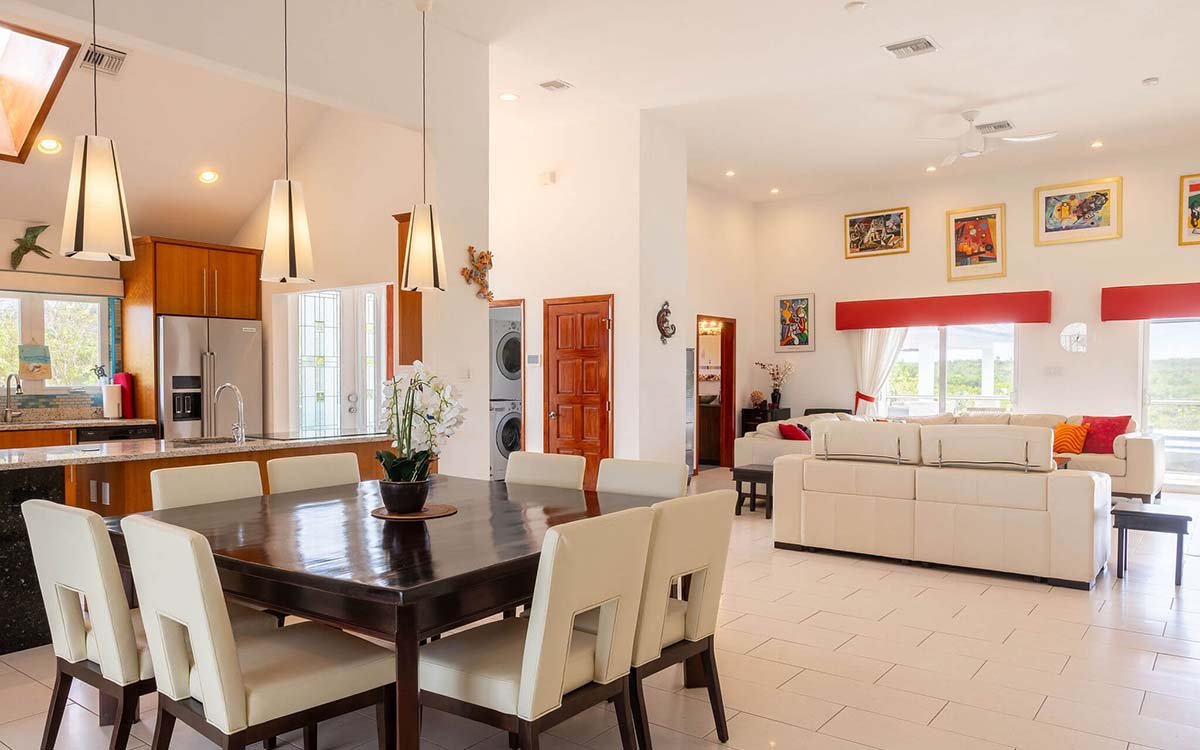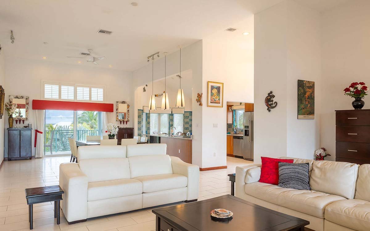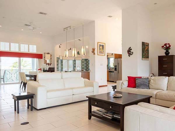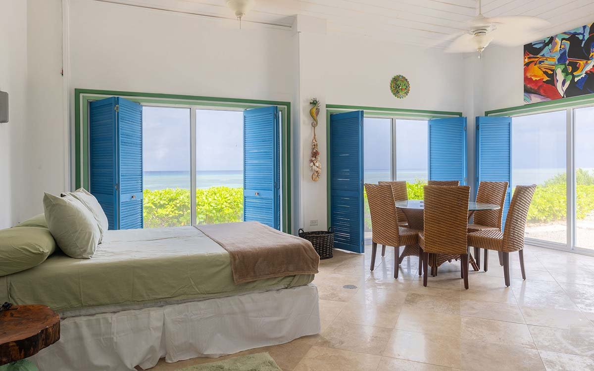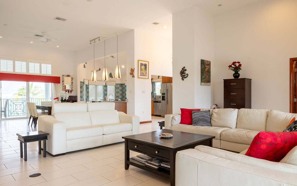 is a spacious beachfront villa just steps from the sand. The screened-in porch, running the width of the house, is the perfect place to relax and enjoy the sunset. While this villa is within walking distance of Rum Point, it’s also extremely private. The waters here are very calm, with no crashing waves, making it perfect for young kids and kayakers.