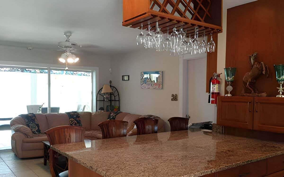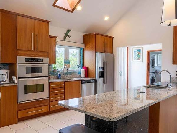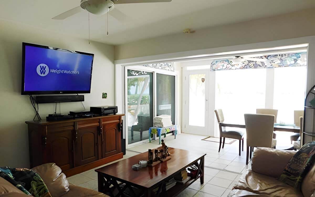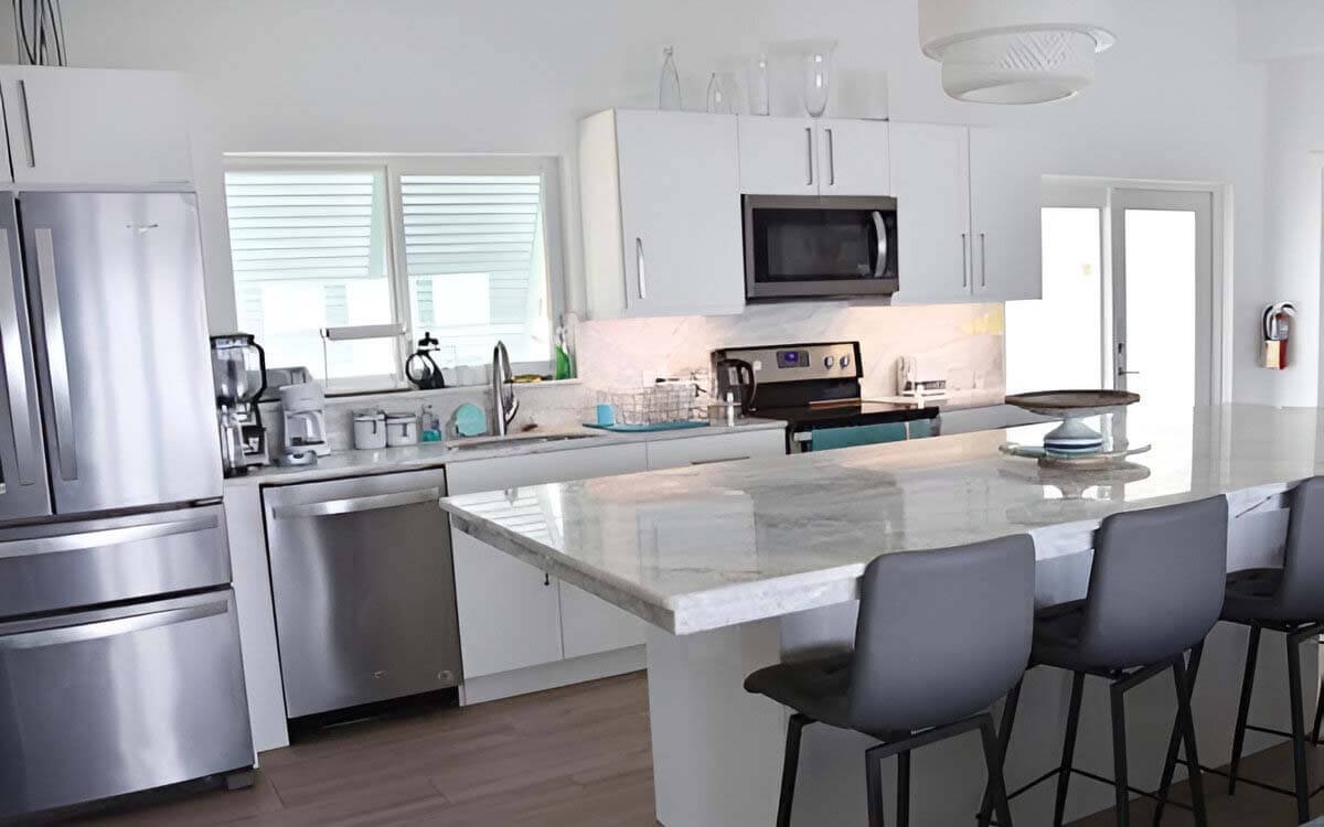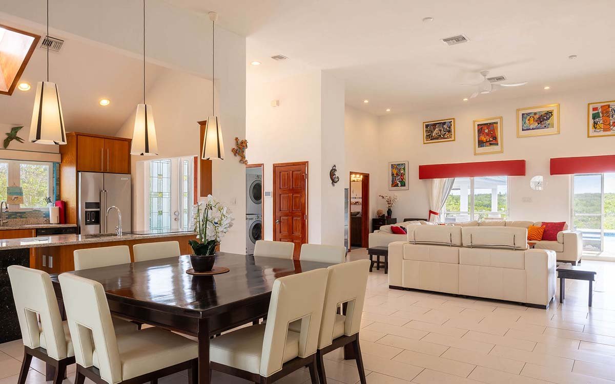 is a spacious beachfront villa just steps from the sand. The screened-in porch, running the width of the house, is the perfect place to relax and enjoy the sunset. While this villa is within walking distance of Rum Point, it’s also extremely private. The waters here are very calm, with no crashing waves, making it perfect for young kids and kayakers.